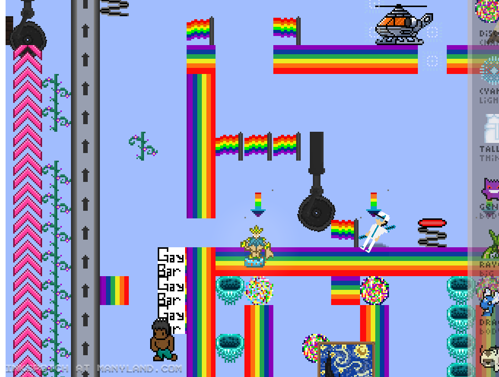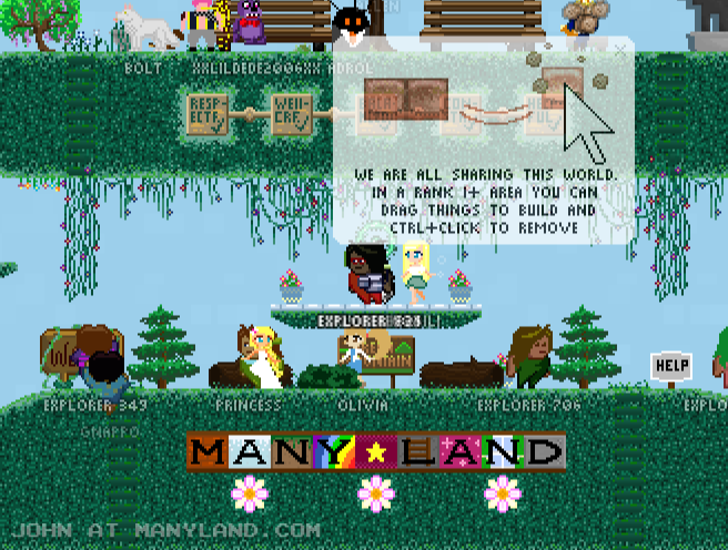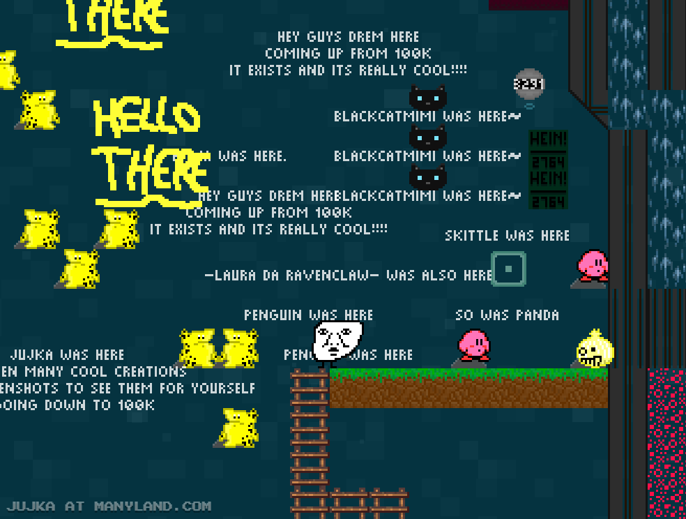 Unfortunately, Manyland – the universe we lived, scripted & drew together – had to close due to a lack of budget, which also meant a lack of budget for updates. Thanks to all of you and let us remember the good times with this Museum site! Together, in the 10 years from July 29th 2013 to February 29th 2024, we made over 800,000 areas, 6 million items, 900 million placements... and countless memories & friendships.