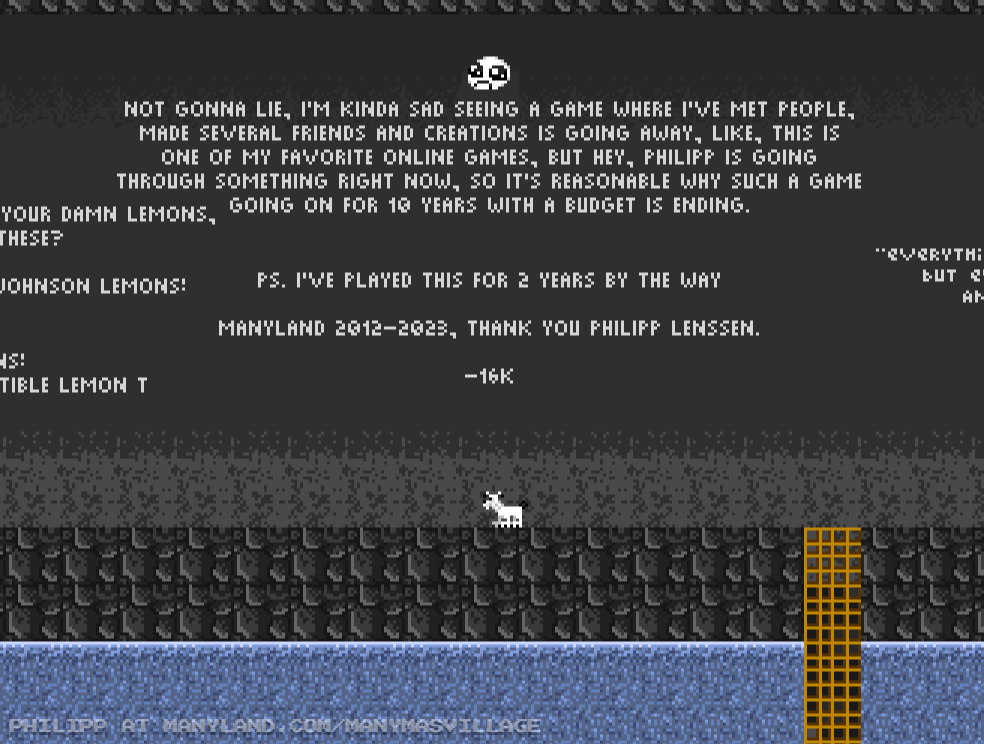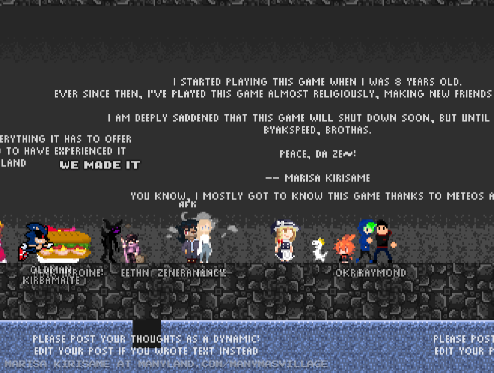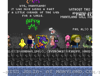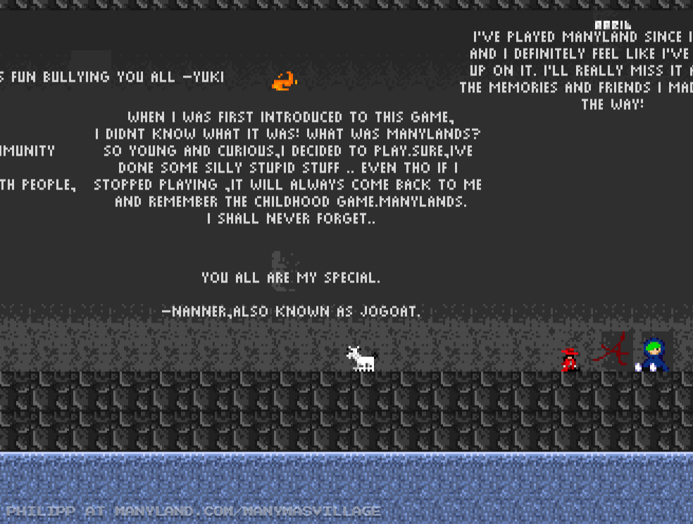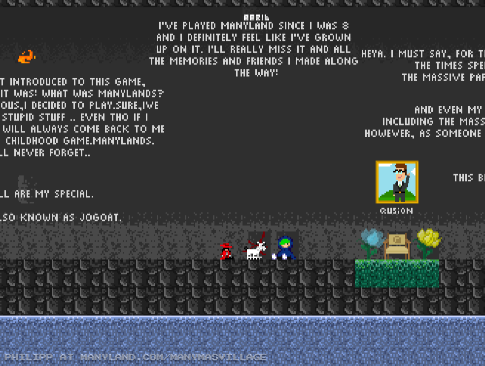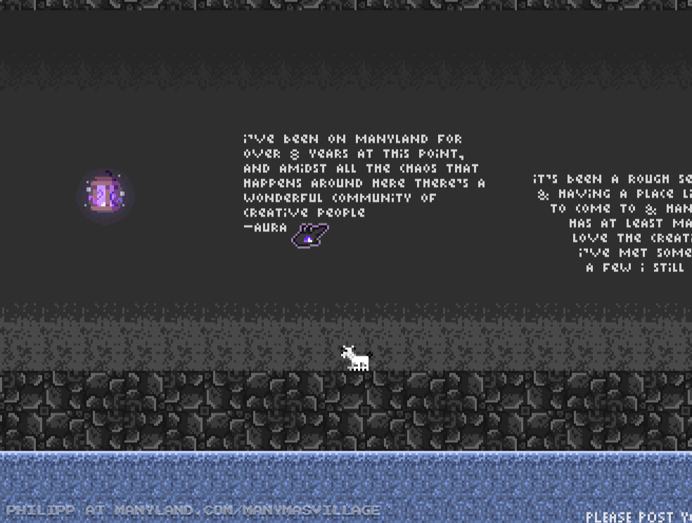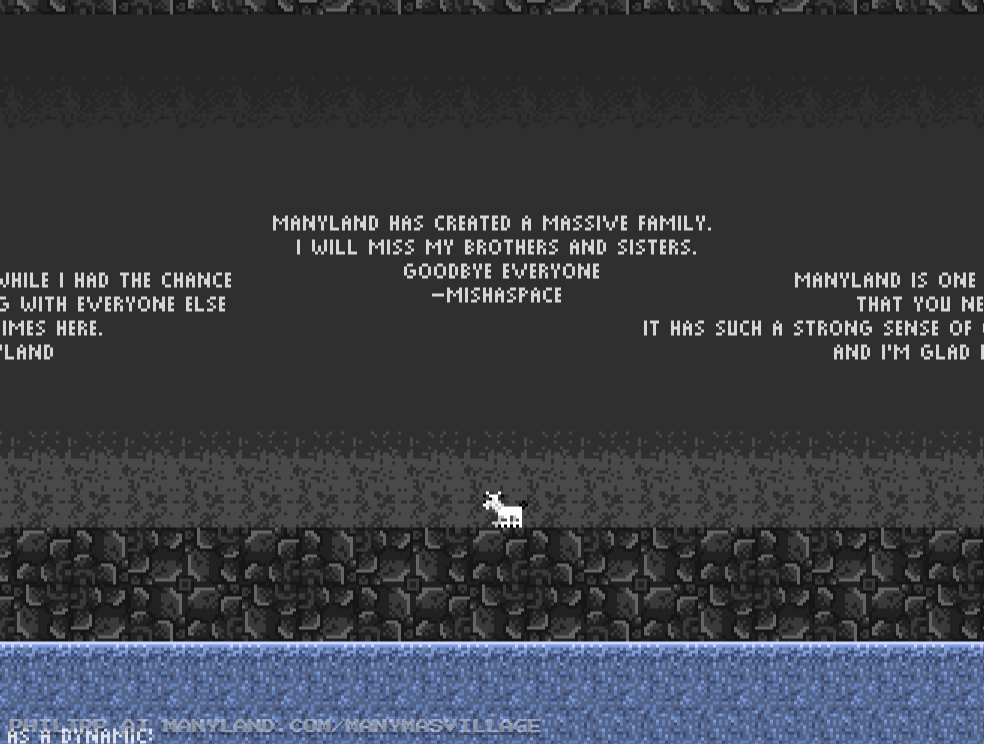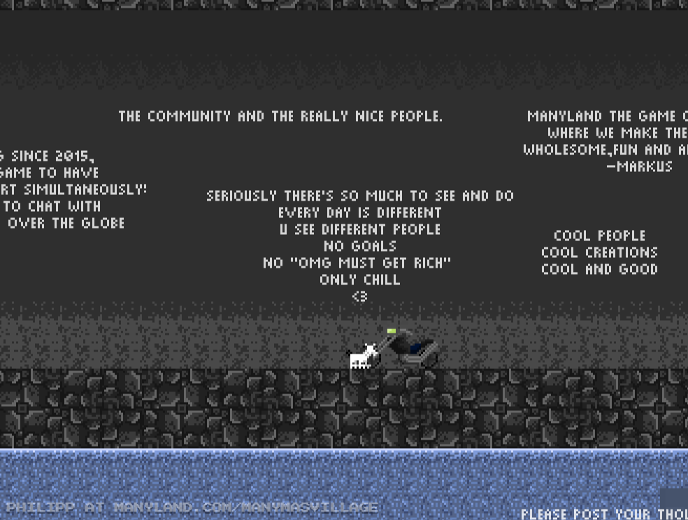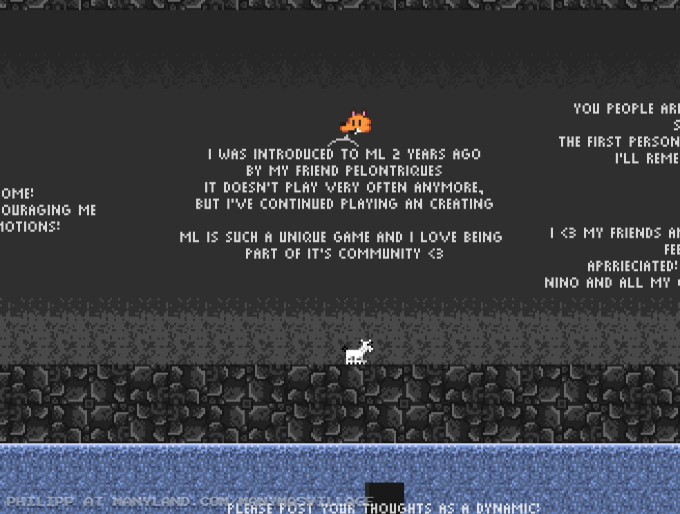 Unfortunately, Manyland – the universe we lived, scripted & drew together – had to close due to a lack of budget, which also meant a lack of budget for updates. Thanks to all of you and let us remember the good times with this Museum site! Together, in the 10 years from July 29th 2013 to February 29th 2024, we made over 800,000 areas, 6 million items, 900 million placements... and countless memories & friendships.