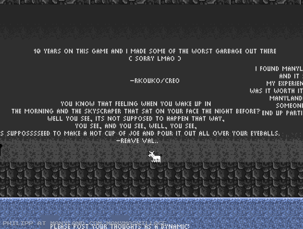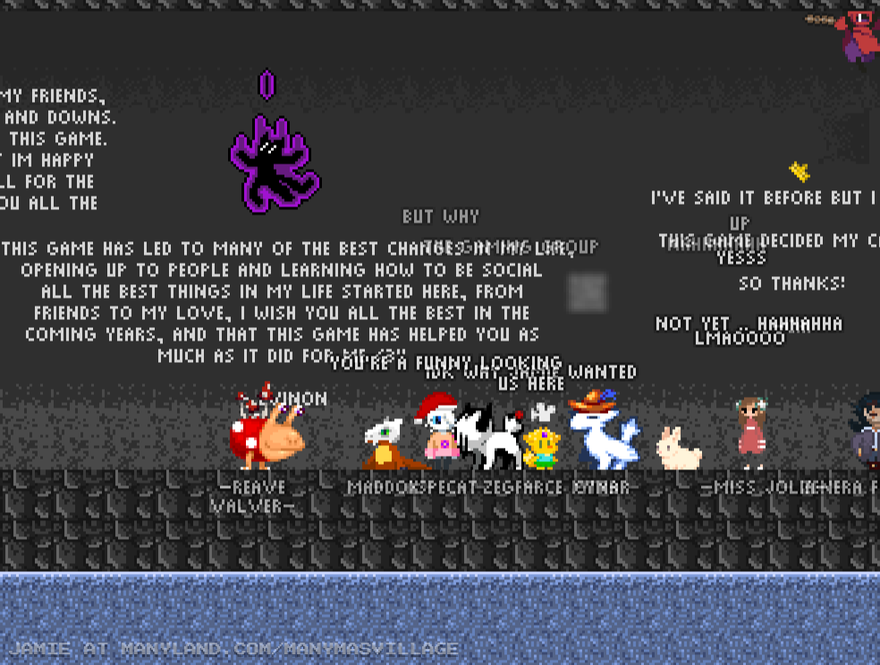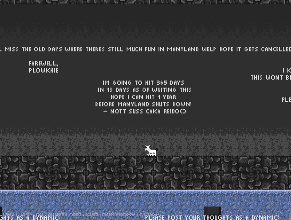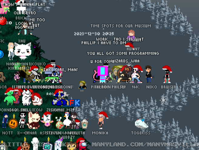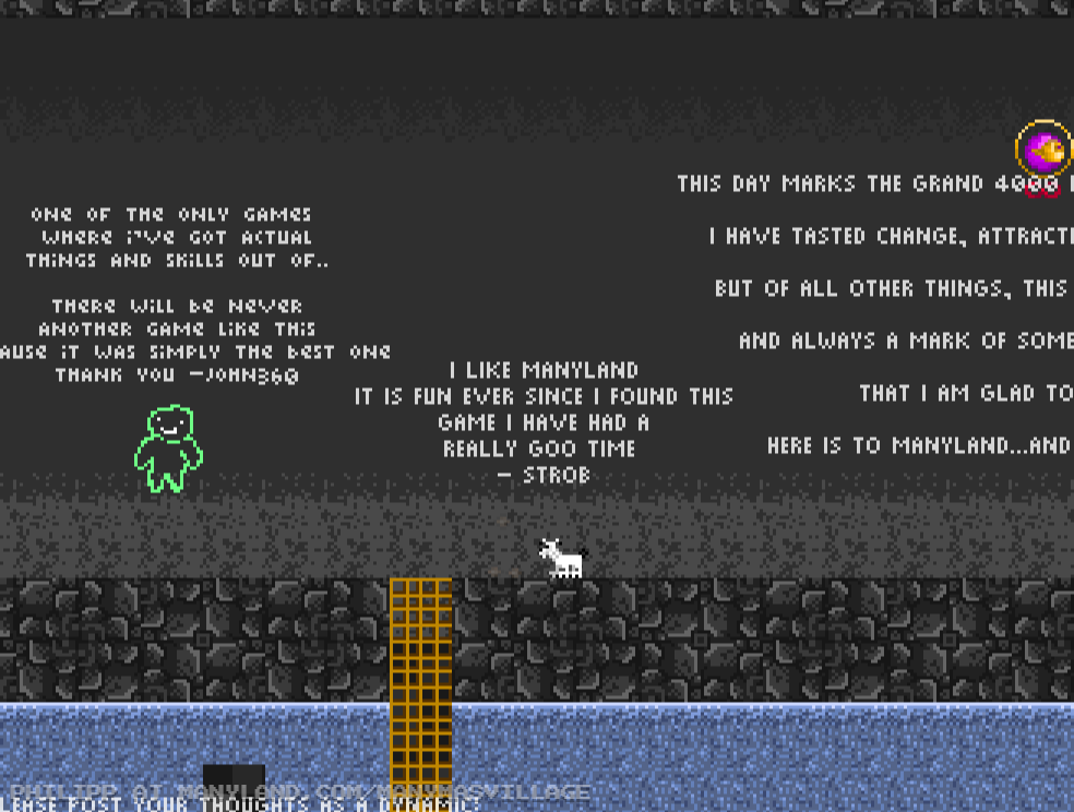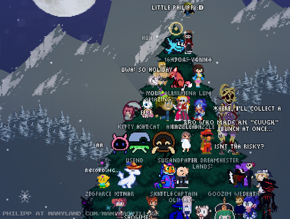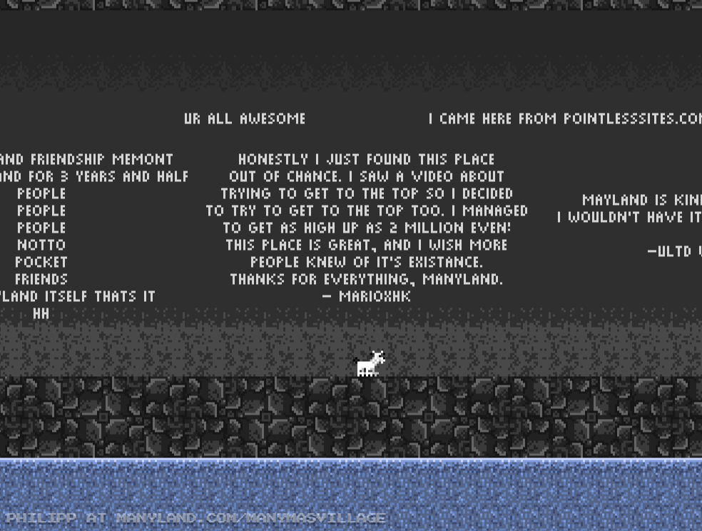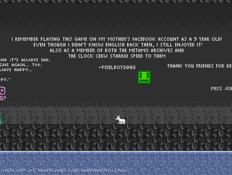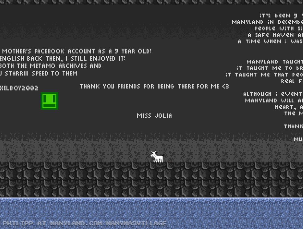 Unfortunately, Manyland – the universe we lived, scripted & drew together – had to close due to a lack of budget, which also meant a lack of budget for updates. Thanks to all of you and let us remember the good times with this Museum site! Together, in the 10 years from July 29th 2013 to February 29th 2024, we made over 800,000 areas, 6 million items, 900 million placements... and countless memories & friendships.