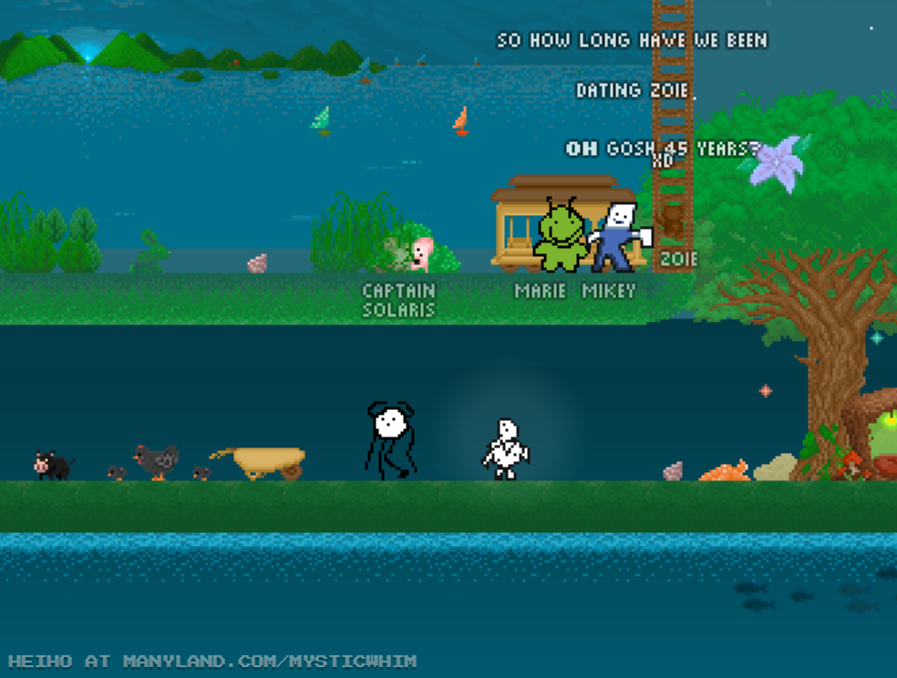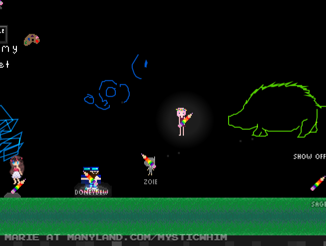 Unfortunately, Manyland – the universe we lived, scripted & drew together – had to close due to a lack of budget, which also meant a lack of budget for updates. Thanks to all of you and let us remember the good times with this Museum site! Together, in the 10 years from July 29th 2013 to February 29th 2024, we made over 800,000 areas, 6 million items, 900 million placements... and countless memories & friendships.