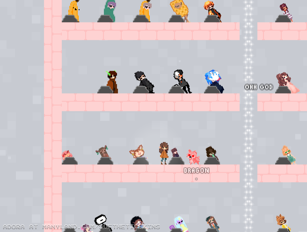 Unfortunately, Manyland – the universe we lived, scripted & drew together – had to close due to a lack of budget, which also meant a lack of budget for updates. Thanks to all of you and let us remember the good times with this Museum site! Together, in the 10 years from July 29th 2013 to February 29th 2024, we made over 800,000 areas, 6 million items, 900 million placements... and countless memories & friendships.